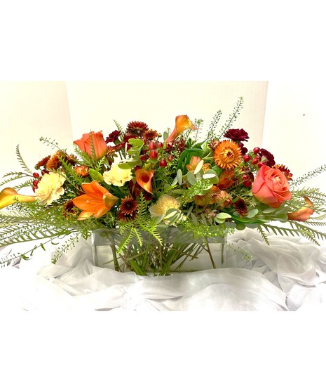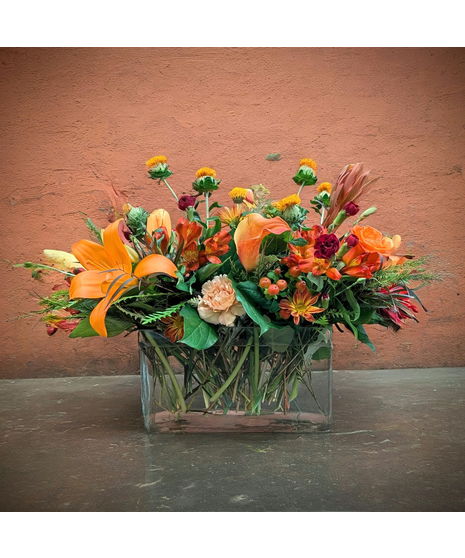 Fall Fever features a vibrant and warm autumn-inspired palette, artfully composed in a clear rectangular glass vase. The bouquet showcases a stunning blend of flowers late summer harvest and autumn flowers.