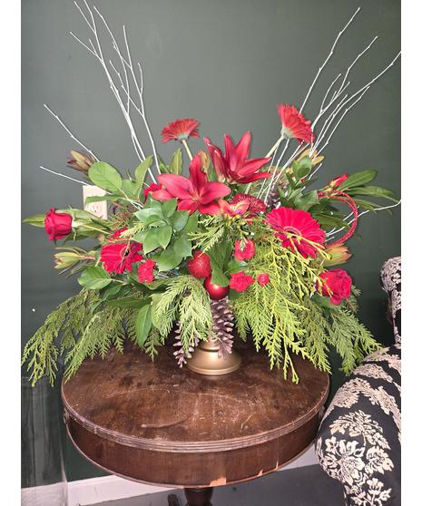 Bring the magic of a winter forest indoors with this lush, cascading holiday arrangement. Rich emerald greenery spills dramatically downward, mingling with bold crimson accents and touches of festive sparkle. Perfectly balanced for a dining table, mantel, or entry console. This one of a kind centerpiece captures the spirit of Christmas in full, luxurious bloom.