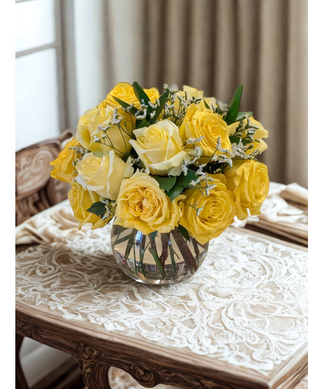 Joyous Sweetheart is a cheerful bouquet of sunny yellow blooms with lush, layered petals, accented by delicate white sprigs and vibrant green leaves. It exudes warmth and sophistication.