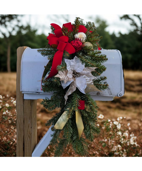 This charming mailbox saddle brings instant holiday elegance to your curbside! A lush evergreen wreath forms the base, adorned with festive ornaments in varying sizes for a touch of winter sparkle. Perfect for snowy landscapes, this festive saddle transforms an everyday mailbox into a welcoming seasonal statement piece. They're also re-usable and can be enjoyed for years to come! Our saddles are made to order and can be customized to the theme of your choice. Be sure to let us know the color scheme you'd like during the checkout process. Please allow 24-48 hours for production.