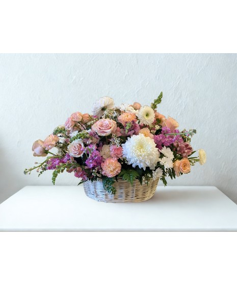 A delightful basket arrangement bursting with soft, pastel-hued blooms in shades of blush pink, warm peach, crisp white, and gentle lavender. The vibrant mix is complemented by lush green foliage and delicate accents, creating a harmonious and inviting display.