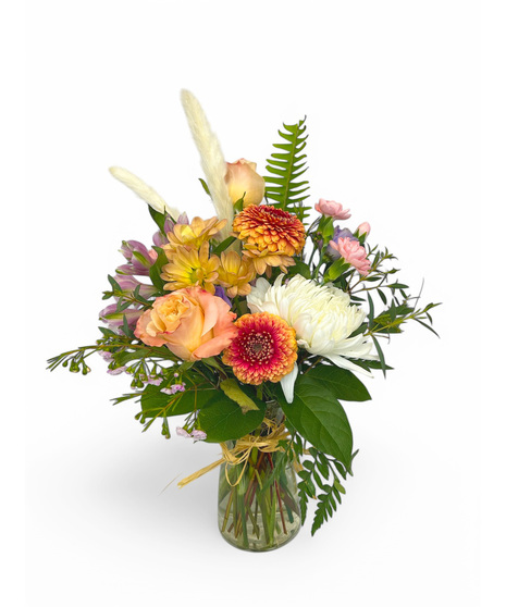 A peach-tastic bouquet displayed in a clear glass vase. It has a mix of peaches, oranges, whites, and pinks along with a soft touch of pampas grass.