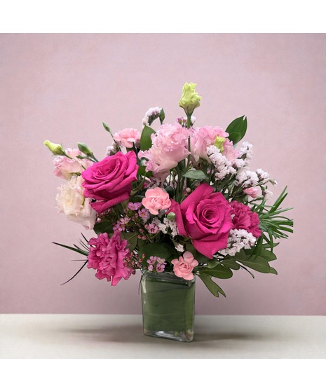 Pink Kiss is a lovely arrangement showcasing a spectrum of pink hues from soft pastels to vibrant magentas, with blooms of varying sizes featuring layered petals, ruffled clusters, and tiny delicate accents, interspersed with fresh green foliage and subtle pale elements.