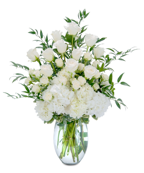 This lush and lovely combination of roses and hydrangea is purely elegant.