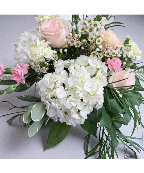 Rosey Dream is a delicate bouquet overflowing with soft white clusters and gentle pink accents, including layered petals in pale hues and tiny budding elements, complemented by fresh green stems and leaves. It radiates a calming and romantic elegance.