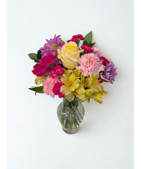 Sweet Daisy is a vibrant bouquet arranged in a clear glass vase, showcasing a lively mix of bold blooms in shades of sunny yellow, deep crimson, soft pink, and rich purple. Accented with fresh green leaves, this cheerful display radiates energy and warmth, making it an ideal gift for celebrations or everyday joy.